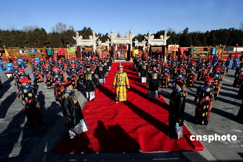 1月26日農(nóng)歷正月初一,第24屆地壇春節(jié)文化廟會(huì)如期舉行,廟會(huì)歷時(shí)8天,至2月1日截止。每年地壇廟會(huì),地壇公園芳澤壇都會(huì)舉行場(chǎng)面宏大的仿清祭地表演,“皇帝”帶領(lǐng)文武百官、侍衛(wèi)儀仗等200余人身著盛裝祭祀,祈求地神保佑、國泰民安、風(fēng)調(diào)雨順、五谷豐登,今年的祭地表演則因?yàn)椤安莞实邸钡暮_x而備受關(guān)注。從普通市民中遴選出來的“草根皇帝”李少華正式上任,迎神送神、三叩九拜,在數(shù)百游園觀眾的注視下,黃袍加身的李少華邁著堅(jiān)定的步伐,完成了一次皇家禮儀文明之旅。中新社發(fā) 富田 攝