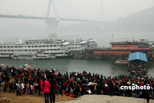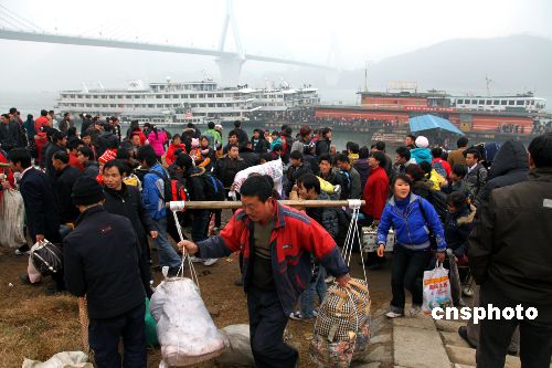 2月3日農(nóng)歷正月初九早8時(shí),長(zhǎng)江宜昌港大公橋客運(yùn)碼頭四條躉船無(wú)一客人、無(wú)一客船,9時(shí),9艘客船同一船閘、同時(shí)停泊宜昌港,一時(shí)間,涌入宜昌港口的出川大軍疏散成“井噴”之勢(shì)。宜昌海事、公安、港口等部門聯(lián)動(dòng)執(zhí)法,35分鐘時(shí)間內(nèi)緊急疏散4500余人,全部是出川農(nóng)民工。據(jù)統(tǒng)計(jì),三峽春運(yùn)期間,常年旅客進(jìn)出客流量約50萬(wàn)人次,其中外出農(nóng)民工乘船超過(guò)40余萬(wàn)人次。據(jù)悉,三峽庫(kù)區(qū)是長(zhǎng)江干線跨省春運(yùn)重點(diǎn)航線,而這一航線又是中國(guó)內(nèi)河農(nóng)民工乘船的專營(yíng)航線,節(jié)前單邊返鄉(xiāng)過(guò)年,節(jié)后單邊出川進(jìn)城打工,客船單邊旅客、客船高度集中,是中國(guó)內(nèi)河不多見(jiàn)的春運(yùn)現(xiàn)象。中新社發(fā) 望作信 攝