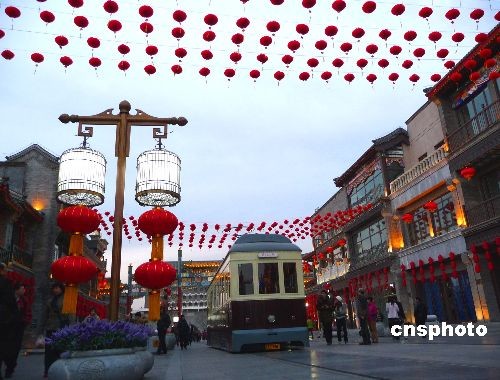 2009年2月7日(農(nóng)歷正月十三),大紅燈籠懸掛北京前門(mén)大街,迎接元宵佳節(jié)到來(lái)。據(jù)悉,2月9日(農(nóng)歷正月十五),前門(mén)大街將舉行元宵節(jié)踩街活動(dòng),來(lái)自北京、河北、山東的花會(huì)隊(duì),將從正陽(yáng)門(mén)箭樓南側(cè)和前門(mén)五牌樓之間被彩綢包圍的“儀式場(chǎng)”出發(fā)。16只南獅和北獅將為大隊(duì)人馬開(kāi)道,隨后,中幡、旱船、二魁摔跤、地秧歌、鼓子秧歌等將依次向珠市口行進(jìn)。中新社發(fā) 玉龍 攝