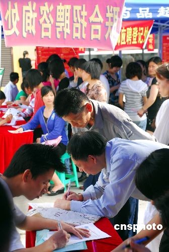 2009年2月16日,海南省就業(yè)局聯(lián)合大型零售企業(yè),在?凇⑷齺、澄邁等全省8個市縣同時舉行針對弱勢群體的大型現(xiàn)場招聘會,專門招收下崗職工、失業(yè)人員、零就業(yè)家庭人員、大中專畢業(yè)待業(yè)青年和農(nóng)民工。用人單位對聘用人員一律進行培訓上崗,無論哪個工種的工資,都不低于所在市縣的最低生活保障金,且到崗就給購買各項保險。中新社發(fā) 善平 攝