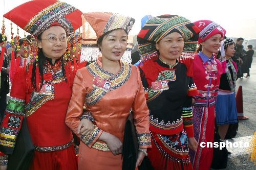 3月5日上午,十一屆全國(guó)人大二次會(huì)議在北京人民大會(huì)堂開(kāi)幕,來(lái)自廣西的女代表手挽手步入會(huì)場(chǎng)。中新社發(fā) 盛佳鵬 攝