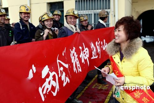 3月11日,安徽恒源煤電公司宣傳員在井口給礦工宣傳“兩會(huì)”精神。自3月5日“兩會(huì)”召開(kāi)以來(lái),安徽恒源煤電公司組織了“兩會(huì)”精神在礦山宣傳隊(duì),向礦工們宣傳了“兩會(huì)”召開(kāi)的意義和“兩會(huì)”上有關(guān)礦山安全生產(chǎn)、百姓切身利益等相關(guān)內(nèi)容。中新社發(fā) 黃啟軍 攝