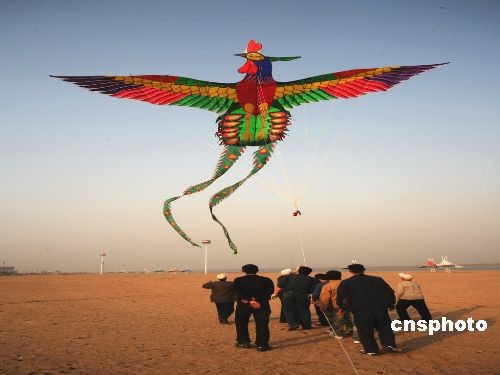 3月18日下午,一只巨型鳳凰風(fēng)箏在臨沂城區(qū)段沂河岸邊起飛,引來(lái)許多市民觀賞 。這只風(fēng)箏由臨沂鳶友俱樂部楊寶玉主任設(shè)計(jì)并同風(fēng)箏愛好者耗時(shí)兩個(gè)多月制作完成。該風(fēng)箏長(zhǎng)65.8米,雙翅展距20.4米,用碳素鋼管和防雨綢扎制,是目前世界上軟翅類最大的風(fēng)箏,他們準(zhǔn)備在4月份攜帶該風(fēng)箏參加第26屆濰坊國(guó)際風(fēng)箏節(jié),一展臨沂風(fēng)箏愛好者風(fēng)采。 中新社發(fā) 梅魯生 攝