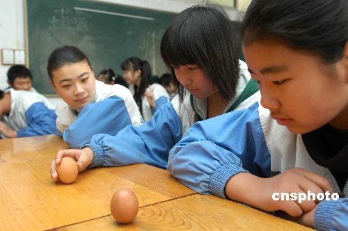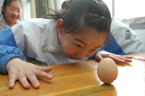 3月20日,山東鄒平縣實(shí)驗(yàn)中學(xué)的學(xué)生在立雞蛋。當(dāng)日是春分,我國(guó)民間有在這天立雞蛋的傳統(tǒng),在春分立蛋的說法中,認(rèn)為春分這一天,太陽直射在赤道上,地球的引力會(huì)發(fā)生變化,雞蛋所受到的重力會(huì)隨著引力的變化而變化,因此雞蛋會(huì)更容易站立起來。中新社發(fā) 董乃德 攝