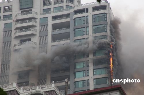 二十六日上午十一時(shí),廣州市濱江東路中山大學(xué)牌坊文化廣場(chǎng)旁一高層住宅樓發(fā)生火警,火勢(shì)從大樓外墻電線一直向樓頂蔓延,幸有消防員及時(shí)撲救,事故中無(wú)人員傷亡。中新社發(fā) 羅仰明 攝