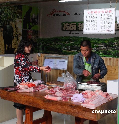 近日,產(chǎn)自云南西雙版納的珍稀品種小耳豬在昆明上市,每公斤瘦肉標(biāo)價(jià)九十八元,被市民稱為“天價(jià)”豬肉。版納小耳豬具有2000多年歷史,是全國(guó)唯一由本土野豬馴化而來(lái)的本地豬種,2002年被列入《國(guó)家級(jí)畜禽品種資源保護(hù)名錄》,由西雙版納當(dāng)?shù)厣贁?shù)民族在原始森林放養(yǎng),是真正的“生態(tài)豬肉”。甫一上市,便受到不少昆明市民的青睞。圖為來(lái)購(gòu)買(mǎi)小耳豬肉的昆明市民。中新社發(fā) 劉冉陽(yáng) 攝
