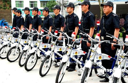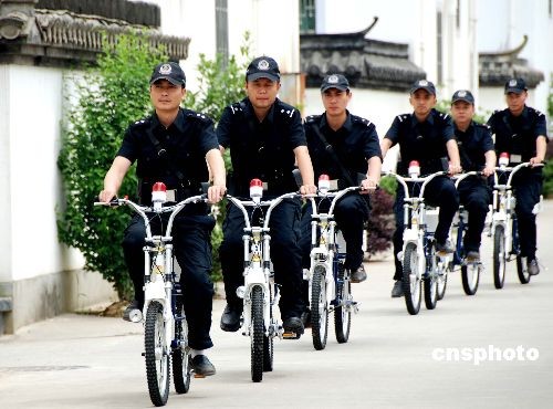 5月5日,江西婺源的大街小巷的城區(qū)出現(xiàn)了一支特警自行車治安巡邏隊。他們騎乘統(tǒng)一配發(fā)的輕便自行車,車前掛有“巡警110”標(biāo)志,車后配備便民服務(wù)箱。為群防群治,共織平安網(wǎng),婺源縣公安局特警大隊由60人組成的一個特色 “警務(wù)自行車巡邏隊”,以適應(yīng)該縣轄內(nèi)小街巷多、警車巡邏不易覆蓋的治安特點。同時利用自行車巡邏既環(huán)保、便捷、無噪音,又可增加古城小道的見警率,還避免了機(jī)動車頻繁流動造成的道路擁堵, 大大提高“走街串巷”治安巡防的效率,延伸了公安機(jī)關(guān)對社會面的防控觸角。 中新社發(fā) 王國紅 攝