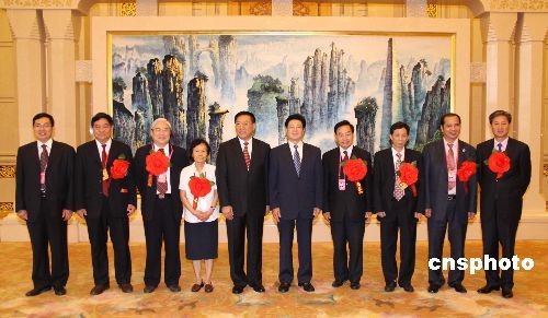 7月14日,全國“僑界十杰”在北京人民大會與全國人大常委會副委員長王兆國、中國僑聯(lián)主席林軍合影。當(dāng)日,全國“僑界十杰”評選產(chǎn)生,獲選的是:北京華騰東光科技發(fā)展有限公司高級工程師羅益鋒,吉林大學(xué)汽車學(xué)院教授郭孔輝,福建省光學(xué)技術(shù)研究所高級工程師賴愛光,中國科學(xué)院海洋研究所研究員鄭守儀,廣東韶關(guān)鋼鐵集團有限公司主任工程師、高級技師羅東元,海南省農(nóng)墾總局副局長、南田農(nóng)場場長彭隆榮,中國科學(xué)院院士、世界著名數(shù)學(xué)家吳文俊,國家體育總局體操中心副主任、國家級教練黃玉斌,中國航空工業(yè)集團公司北京航空材料研究院高級顧問顏鳴皋,神華集團有限公司總經(jīng)理張玉卓。中新社發(fā) 史利 攝