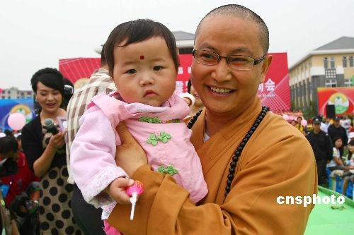 5月13日,“祝福明天——四川什邡地震羅漢娃生日抓周會(huì)”在四川什邡市北京小學(xué)舉行。去年汶川大地震時(shí),在什邡羅漢寺降生的108名嬰兒,齊聚出生地慶祝周歲生日,并參加傳統(tǒng)的抓周儀式。2008年四川地震將什邡市婦幼保健院大樓震成危房,千年古剎羅漢寺打破禁忌收留產(chǎn)婦和孕婦。此后的3個(gè)月中,共有108嬰兒在此降生,被人們稱(chēng)為“羅漢娃”!白ブ堋笔窃诤⒆又軞q的時(shí)候舉行的預(yù)測(cè)前途和性情的儀式,帶有家庭游戲性質(zhì)的民間習(xí)俗。中新社發(fā) 富田 攝