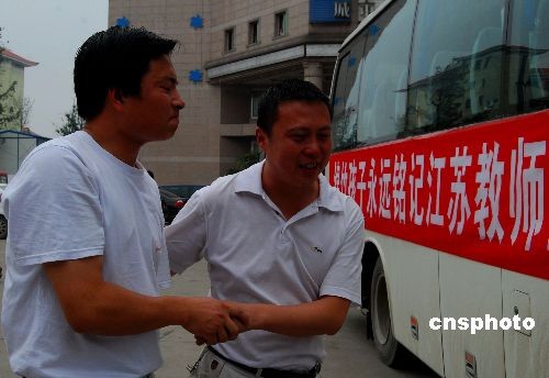 6月16日中午,綿竹地震災(zāi)區(qū)最后一批52名江蘇幫扶支教老師圓滿(mǎn)完成為期131天的支教任務(wù),離開(kāi)綿竹踏上歸途。綿竹社會(huì)各界群眾和學(xué)生組成的軍樂(lè)隊(duì)前來(lái)為他們送行。據(jù)悉,地震后,江蘇省先后派遣了110名中小學(xué)骨干教師前往綿竹災(zāi)區(qū)各中小學(xué)擔(dān)負(fù)支教任務(wù)。中新社發(fā) 胥輝 攝