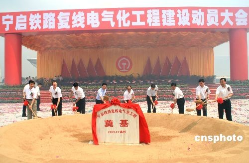 7月14日,寧啟鐵路復(fù)線電氣化工程建設(shè)動員大會在江蘇省泰州市泰州火車站舉行。國家鐵道部部長劉志軍、江蘇省委書記梁保華、省長羅志軍,上海鐵路局局長安路生以及泰州市委書記張雷等出席。寧啟線路全長約268.3公里,項目總投資139億元,工期3年。建成后南京至南通運行時間將從3小時50分縮短至1小時50分。圖為鐵道部、江蘇省有關(guān)領(lǐng)導(dǎo)共同為工程奠基。中新社發(fā) 崔佳明 攝