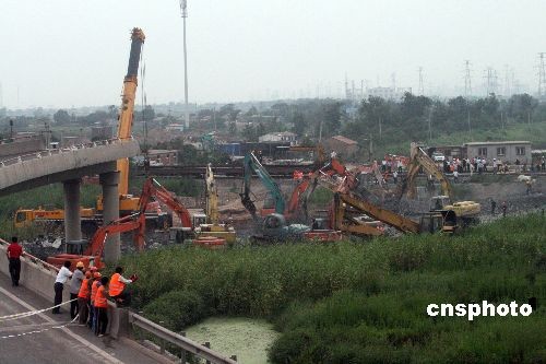 七月十五日凌晨一時(shí)三十三分,津晉高速公路港塘收費(fèi)站八百米外匝道橋坍塌,五輛載貨車墜落,造成六人死亡,四人受傷。事故發(fā)生后,天津市各相關(guān)部門迅速趕到現(xiàn)場(chǎng)實(shí)施救援清理。截至目前,受傷人員傷情穩(wěn)定,沒有生命危險(xiǎn)。各項(xiàng)善后工作正在有序進(jìn)行。事故原因正在調(diào)查中。中新社發(fā) 郭曉帆 攝