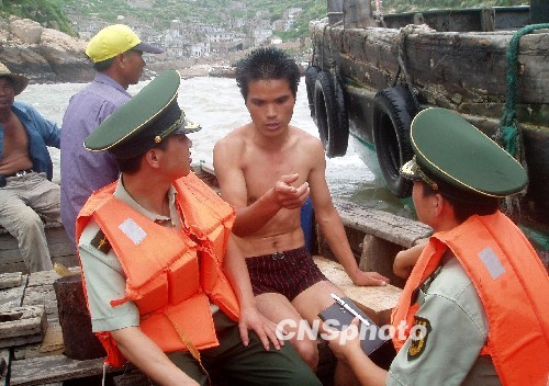 7月18日,受今年第6號(hào)臺(tái)風(fēng)“莫拉菲”外圍影響,浙江省溫州市南麂島海域風(fēng)浪大增,一艘船號(hào)為“浙平30057”的漁船被風(fēng)浪掀翻,船上3名漁民全部落水。接警后,南麂邊防派出所立即啟動(dòng)海上應(yīng)急救助預(yù)案,迅速組織船舶趕赴事發(fā)海域展開搜救,成功將一名抱著木板逃生的漁民營(yíng)救上岸,另2名漁民失蹤。目前,搜救工作仍在緊張進(jìn)行中。圖為南麂邊防派出所官兵向獲救漁民了解沉船情況。中新社發(fā) 吳水斌 攝