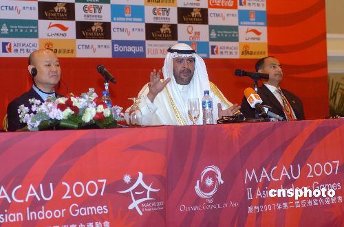 十月二十八日,亞奧理事會(huì)主席薩巴赫親王(中)在澳門第二屆亞洲室內(nèi)運(yùn)動(dòng)會(huì)記者會(huì)上,盛贊第二屆亞洲室內(nèi)運(yùn)動(dòng)會(huì)的組織工作非常成功,今后會(huì)更加成功。中新社發(fā) 史利 攝