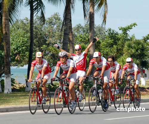 來(lái)自二十四個(gè)國(guó)家和地區(qū)的十八支參賽隊(duì)伍、一百零六名自行車手已于十一月二日全部抵達(dá)海南三亞。上午九時(shí)許,各隊(duì)選手開始熱身,為明天開始的海馬汽車二00七環(huán)海南島國(guó)際公路自行車賽做準(zhǔn)備。中新社發(fā) 彭小云 攝