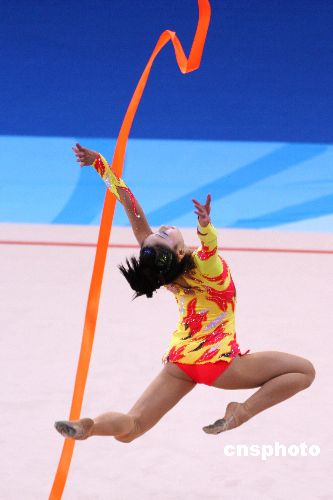 圖為中國(guó)選手丁一丹在進(jìn)行繩操比賽,她晉級(jí)了明日的決賽。