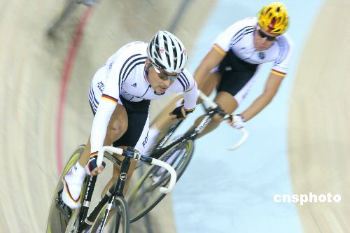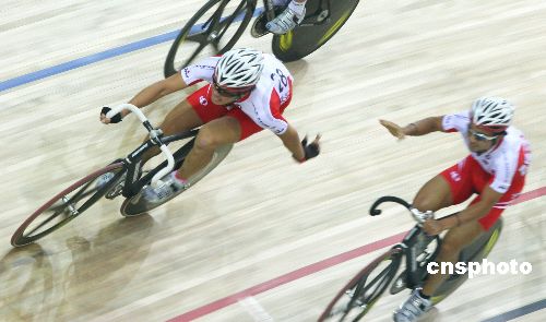 12月9日,“好運(yùn)北京”2007-2008國際自盟場地自行車世界杯賽在老山自行車館閉幕。圖為最后一項(xiàng)男子麥迪遜40公里的決賽。在男子麥迪遜賽中,每隊(duì)有兩名選手組成,是完成途中沖刺的比賽。根據(jù)各隊(duì)完成比賽的距離和所獲得的沖刺得分,可以決定最終的名次。此外,如果一支隊(duì)伍能夠領(lǐng)先其他車隊(duì)一圈或一圈以上,那無論沖刺得分是多少都將獲勝。中新社發(fā) 富田 攝