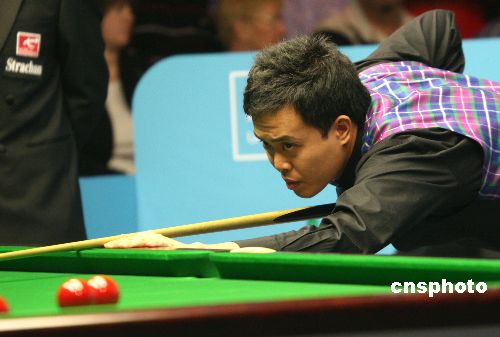 當(dāng)?shù)貢r間12月11日晚,英國泰爾福德,中國香港斯諾克選手傅家俊以九比二大比分戰(zhàn)勝對手喬·佩里,首次殺入斯諾克英錦賽八強。圖為傅家俊在比賽中。中新社發(fā) 李鵬 攝