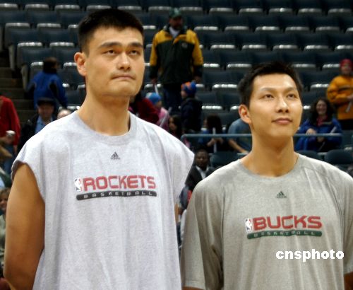 當(dāng)?shù)貢r(shí)間二月二日,由姚明領(lǐng)軍的NBA休斯頓火箭隊(duì)作客密爾沃基,挑戰(zhàn)另一位中國(guó)球員易建聯(lián)所效力的雄鹿隊(duì)。此為火箭和雄鹿在本賽季的第二次交鋒。姚明(左)和易建聯(lián)(右)賽前互致問候并合影。中新社發(fā) 李靜 攝