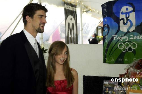 當(dāng)?shù)貢r(shí)間5月10日晚在巴爾的摩游泳俱樂部舉行的“巴爾的摩北京奧運(yùn)奪金倒計(jì)時(shí)”籌款晚會上,上屆奧運(yùn)曾經(jīng)為美國隊(duì)奪得六枚金牌的美國游泳男一號種子選手邁克爾·費(fèi)爾普斯被眾多來賓爭相邀請合影。圖為一名美國少女爭取機(jī)會和邁克爾合影。中新社發(fā) 邱江波 攝