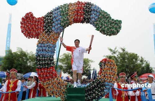 7月10日,奧運火炬在內(nèi)蒙古赤峰市進行傳遞;鹁媸钟诮ㄔO(shè)穿過用福娃組成的“玉龍”。在赤峰翁牛特旗出土的紅山文化標(biāo)志性文物——玉龍,被史學(xué)界定為“中華第一龍”。中新社發(fā) 廖攀 攝