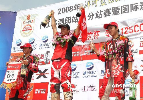 9月21日,2008年全國摩托車越野錦標(biāo)賽泗陽站暨國際越野摩托車邀請賽在江蘇泗陽結(jié)束,來自香港國際精英隊(duì)的賴智豐獲得國內(nèi)專業(yè)125cc組冠軍,云南紅河隊(duì)的師羽萌、劉浪分獲第二、三名。中新社發(fā) 趙振清 攝