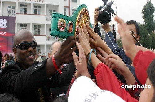 圖為WBC將金腰帶送給了學(xué)校,孩子們爭(zhēng)相伸手撫摸金腰帶,希望能從中吸取勇敢的力量。
