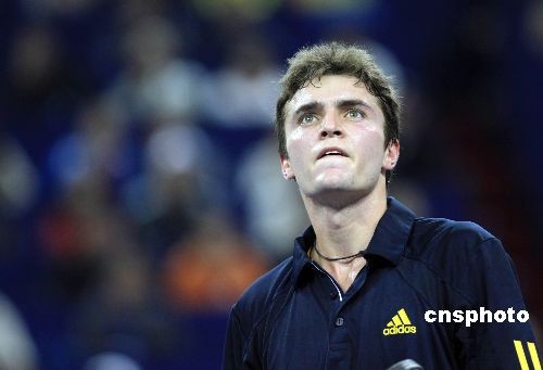 11月10日,在上海旗忠網(wǎng)球中心進(jìn)行的上海大師杯金組單打比賽中,世界網(wǎng)壇名將瑞士天王費(fèi)德勒苦戰(zhàn)3盤,以1比2不敵法國小將西蒙,爆出本屆大師杯開賽以來一大冷門。中新社發(fā) 湯彥俊 攝