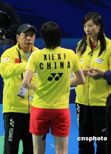 11月19日,在上海舉行的2008年中國(guó)羽毛球公開賽展開正賽首輪爭(zhēng)奪,中國(guó)羽壇老將、北京奧運(yùn)會(huì)女單冠軍張寧(圖右),上任國(guó)家隊(duì)女單教練后首次亮相賽場(chǎng)督戰(zhàn),格外引人關(guān)注。中新社發(fā) 湯彥俊 攝