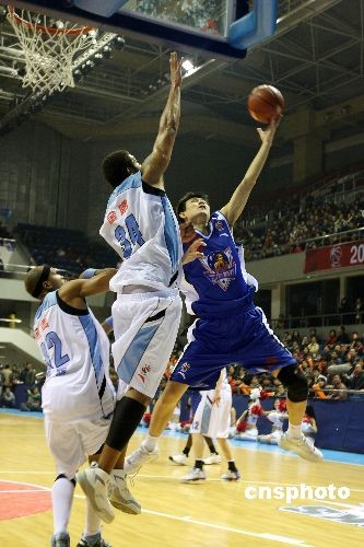 11月23日,在2008—2009賽季CBA聯(lián)賽第四輪比賽中,北京金隅隊主場戰(zhàn)勝天津榮鋼隊,獲得聯(lián)賽開始后的首場勝利。三連敗后的北京金隅回到主場迎接天津榮鋼的挑戰(zhàn)。開場后天津隊雙外援發(fā)揮出色,比分領(lǐng)先,但北京金隅很快適應(yīng)了天津隊的打法,加強防守限制了對方外援在內(nèi)線的發(fā)揮,在第四節(jié)逐漸將分差拉大,逐步奠定了勝勢,最終將比分定格在98比84。中新社發(fā) 王韶驊 攝