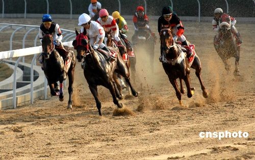 11月26日,2008全國(guó)速度賽馬錦標(biāo)賽在湖北武漢市“東方馬城”揚(yáng)鞭開賽。當(dāng)日下午,分別進(jìn)行了1000米純血馬2個(gè)組和1800米無限定馬2個(gè)組的預(yù)賽,總決賽將于本月30日進(jìn)行。據(jù)了解,本次賽事吸引了包括解放軍代表隊(duì)在內(nèi)的來自全國(guó)20支代表隊(duì)80多名騎師和120余匹賽馬參加。中新社發(fā) 楚天行 攝