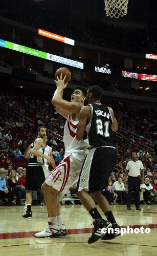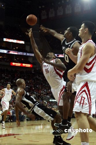 當?shù)貢r間11月29日晚,火箭在主場以103-84大勝馬刺,成為西南區(qū)的領頭羊。火箭首發(fā)五虎得分都上雙,姚明打了27分鐘,拿下12分,但只搶1個籃板,蓋帽3次。中新社發(fā) 歐文 攝