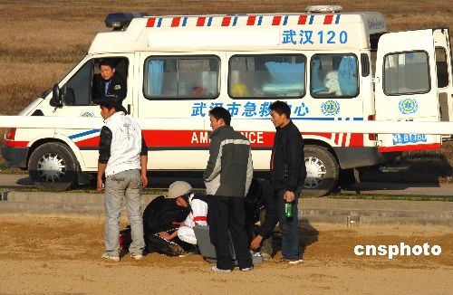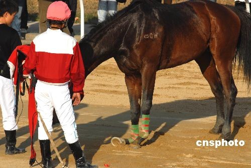11月30日,在湖北武漢市“東方馬城”舉行的2008年全國速度賽馬錦標(biāo)賽上,2600米沙地?zé)o限定馬決賽第二組在比賽時(shí),發(fā)生賽馬“追尾”驚險(xiǎn)一幕。在跑到第二圈進(jìn)入最后全力沖刺時(shí),新疆隊(duì)唐旭駕馭的7號(hào)馬“巴黎之眼”避讓不及北京隊(duì)魏云忠駕馭的10號(hào)馬“賽速”,兩馬重重地撞在一起,“巴黎之眼”當(dāng)場被撞暈倒地不醒,“賽速”右前蹄則被撞斷受傷嚴(yán)重,所幸兩名運(yùn)動(dòng)員均無大礙。據(jù)業(yè)內(nèi)人士介紹,賽馬運(yùn)動(dòng)屬于高風(fēng)險(xiǎn)運(yùn)動(dòng),運(yùn)動(dòng)員和馬匹在激烈的比賽過程中,都有出現(xiàn)意外的可能。中新社發(fā) 楚天行 攝