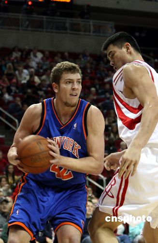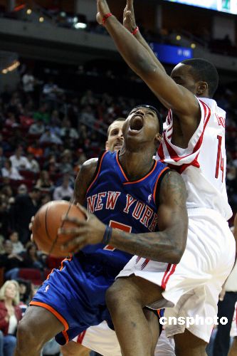 當(dāng)?shù)貢r間1月10日晚,主場作戰(zhàn)的火箭隊(duì)以96比76大勝紐約尼克斯隊(duì)。斯科拉和姚明今天聯(lián)手內(nèi)線有不錯發(fā)揮,火箭全隊(duì)多點(diǎn)開花,第三節(jié)火箭隊(duì)打出進(jìn)攻高潮,最終擊敗尼克斯,取得三連勝。中新社發(fā) 歐文 攝