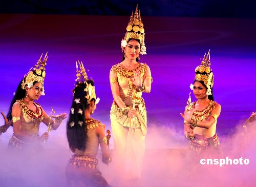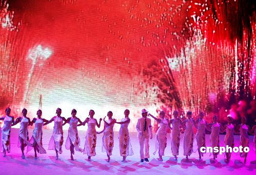 中國中央電視臺2008元旦雙語(漢語、英語)晚會,12月31日晚在北京歡樂谷華僑城大劇院隆重舉行,中央電視臺國際頻道向全世界實況直播。晚會除中國演員外還有日本、韓國、泰國、馬來西亞、新加坡、印度等國家的藝術(shù)家登場獻藝,通過歌曲、舞蹈、雜技、魔術(shù)、服裝秀、戲曲等藝術(shù)形式,向全球華人送去新年祝福。中新社發(fā) 宋吉河 攝