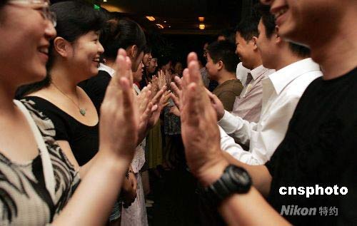 7月19日,眾多北京青年在集體相親會上拍手互動,在活動中尋找自己的愛情。參加此次活動的單身青年大多來自某婚戀網(wǎng)站,很多參加相親活動的年輕人表示,對于自己理想伴侶的要求更多的是希望相互性格、志向、情趣相投。借助婚戀網(wǎng)站平臺線上線下活動去尋找物質(zhì)生活和精神生活完美統(tǒng)一的伴侶。就像徐志摩的詩,“我將在茫茫人海中尋訪我唯一之靈魂伴侶。得之,我幸;不得,我命。”一位參加活動的年輕人笑談,如果徐志摩生活在當下,一定也會通過婚戀網(wǎng)找到自己“唯一之靈魂伴侶”的。中新社發(fā) 楊可佳 攝