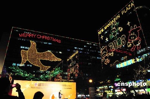 十一月十二日,香港尖東舉行圣誕燈飾亮燈儀式。著名歌星古巨基主持亮燈儀式。各大商場(chǎng)冀在金融危機(jī)中力保市民消費(fèi)意欲。中新社發(fā) 譚達(dá)明 攝