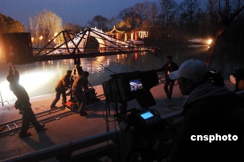 3月9日,新版《紅樓夢》劇組人員在揚州瘦西湖“熙春臺”景區(qū)進行試拍。當日,由李少紅執(zhí)導的新版電視連續(xù)劇《紅樓夢》在揚州瘦西湖景區(qū)取景。中新社發(fā) 范友林 攝