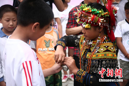 記者在現(xiàn)場看到,來自臺(tái)灣阿里山鄉(xiāng)達(dá)邦國小和屏東縣泰武國小的28名小朋友,為遭受“5.12”地震的北川羌族民眾戴上平安珠手鏈。來自臺(tái)灣屏東縣三地門鄉(xiāng)的王蕓說,希望平安珠能保四川災(zāi)區(qū)羌族人民平安。北川羌族民眾為參訪團(tuán)代表敬獻(xiàn)了羌紅,將平安送給臺(tái)灣“8.8”風(fēng)災(zāi)少數(shù)民族人民。