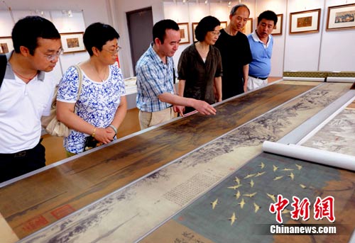 7月8日,觀眾在福州舉辦的“兩岸故宮高仿真宮廷畫聯(lián)展”上被展出的一幅合璧版仿真《富春山居圖》所深深吸引!陡淮荷骄訄D》是元朝畫家黃公望的代表作,是其為無用師和尚所繪,以浙江富春江為背景,全圖用墨淡雅,山和水的布置疏密得當(dāng),墨色濃淡干濕并用,極富變化,被譽(yù)為中國(guó)十大傳世名畫之一,其流傳經(jīng)歷充滿傳奇色彩,目前兩岸各存一段。據(jù)了解,此次“兩岸故宮高仿真宮廷畫聯(lián)展”共展出130余件高仿真作品,囊括了隋唐五代、宋、元、明、清和近代各個(gè)時(shí)期書畫名家的傳世佳作。