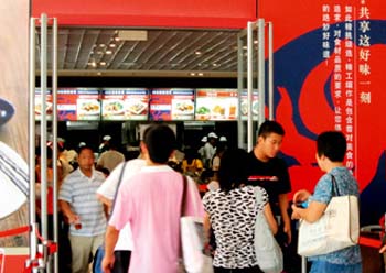 上海天氣炎熱,游客看世博熱情不減。進入世博園區(qū)發(fā)現(xiàn),世博美食正掀起面食大戰(zhàn),四川擔(dān)擔(dān)面、蘭州拉面等各種知名面食在園區(qū)擺開架式招攬食客,臺灣牛肉面也因為口味地道,吸引了游客的目光。這其中最紅火的就有康師傅私房牛肉面、真鍋咖啡和老董牛肉面三家。