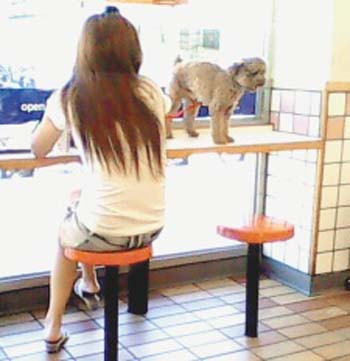 據(jù)悉,19日上午九點多,臺東一對情侶帶著一只小狗到某快餐店,兩人坐在長條餐桌的位子用餐,直接把狗放在桌上;狗就在餐桌上走來走去或躺或坐,直到用餐完畢,兩人才抱著狗離開。