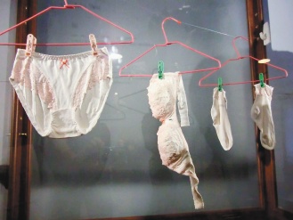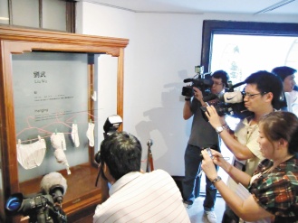 本周一上場、將展到年底的最新一批工藝作品中,劉武創(chuàng)作的“晾”,展示柜高掛女性內衣褲、襪子,連日來引爆話題。昨日上午還有大批陸客圍觀,不少人竊竊私語說:“這真的是女兵內衣褲嗎?”