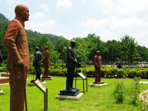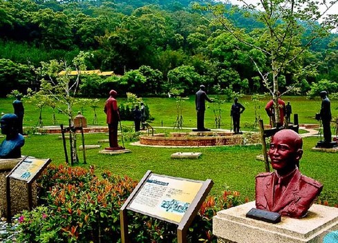 教授告訴我,這個(gè)雕像群落多達(dá)兩百余座蔣介石雕像,因上世紀(jì)90年代后期“去蔣化”運(yùn)動(dòng),各地矗立的銅像紛紛拆除,面臨回爐煉銅的命運(yùn)。慈湖所在的桃園縣當(dāng)時(shí)正值“藍(lán)營”執(zhí)政,于是將各地拆除的銅像收來,選出其中藝術(shù)水準(zhǔn)較高者,建成雕塑群。