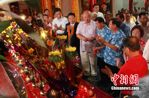 中新網(wǎng)新竹8月18日電(記者 張傳熙)率領(lǐng)廣東省經(jīng)貿(mào)文化交流團訪臺的黃華華省長今天下午從臺北抵達新竹縣展開尋親、訪友的“鄉(xiāng)情之旅”。下午,在新竹縣領(lǐng)導(dǎo)人邱鏡淳及眾多鄉(xiāng)親的陪同下,黃華華到當(dāng)?shù)卮砜图椅幕牧x民廟行禮、祭拜。