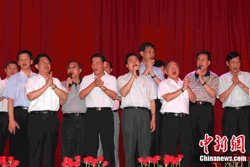 中新網(wǎng)臺(tái)南8月22日電 廣東省省長黃華華率領(lǐng)的廣東經(jīng)貿(mào)文化代表團(tuán)21日在臺(tái)南訪問。圖為21晚黃華華與廣東省其他隨訪官員與臺(tái)灣奇美實(shí)業(yè)股份有限公司董事長廖錦祥等公司負(fù)責(zé)人及員工聯(lián)歡,登臺(tái)合唱一曲《愛拼才會(huì)贏》,表達(dá)了兩岸合作拼搏共創(chuàng)輝煌的共同愿望。 中新社記者 張傳熙 攝影