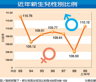 中新網8月30日電 據臺灣《聯(lián)合報》報道,臺灣人口結構再惡化。2010年上半年出生率創(chuàng)歷年新低,新生兒性別失衡更急遽惡化,男女嬰幼兒比例為110:100,為近6年來最嚴重。此外,有婦產科學者指出,產婦在“傳宗接代”的壓下力,透過母血篩檢等手法,只為“求得一子”。