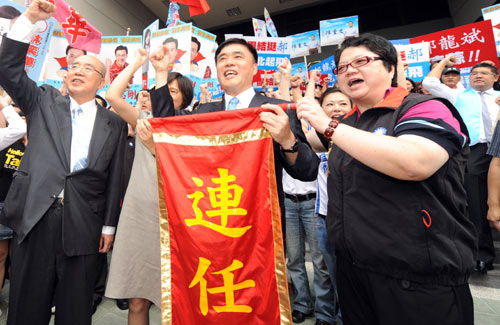 郝龍斌15日下午由高閬仙、吳伯雄及大批藍(lán)營市議員、里長參選人陪同,前往臺北市選舉委員會辦理登記,F(xiàn)場有支持者請來舞龍舞獅、有人獻(xiàn)上象征“包中”的包子與粽子,不少人高喊“郝龍斌凍蒜(當(dāng)選)”、“連任成功”。