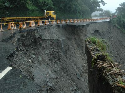 遭遇豪雨的蘇花公路遇雨則坍,南方澳到東澳間多處坍方。臺(tái)灣“災(zāi)害應(yīng)變中心”表示,一輛弘泰旅游公司載運(yùn)大陸觀光客的游覽車在東澳受困,疑被落石擊中,大陸導(dǎo)游及司機(jī)困在變形車體內(nèi),深夜確定2人死亡,其他旅客無(wú)恙;另傳有一輛創(chuàng)意旅游公司的游覽車,搭載廣東團(tuán)共19人失聯(lián)。