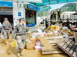 昨天一早大水消退后,蘇澳民眾在四千多名臺軍協(xié)助下,展開清理家園工作。蘇澳主要道路中山路上原本是雙線道,但因災民將家中受損的家具、沙發(fā),全部搬到大馬路暫時堆置,整個蘇澳市彷佛就像大型垃圾場般紊亂,加上軍用卡車、垃圾車、推土機不斷來回,過往交通一度受阻。